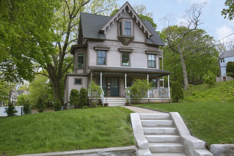 The residential structure was built in 1852 of a gothic revival style and is characterized with ornate detailing of the mid nineteenth century. The gingerbread style home is embellished with historic bargeboards and an ornate frieze on the front façade making it a one-of-a-kind building in the Roxbury Highlands.